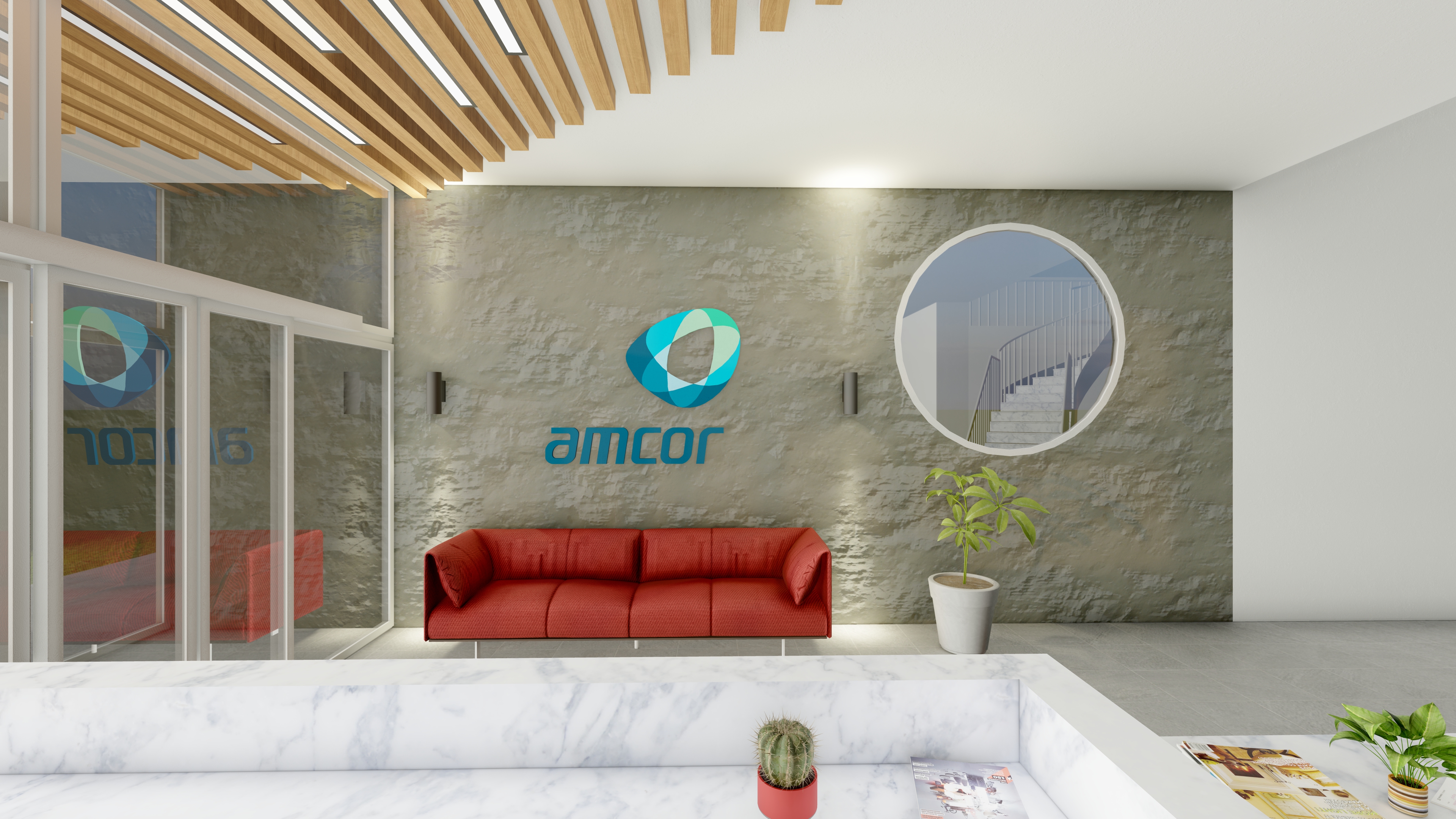 - Ahşap dikey paneller ve entegre aydınlatmalarla vurgulanan tavan tasarımı, mermer resepsiyon bankosu ile birleşerek sofistike bir giriş atmosferi sunuyor. Duvar boyunca yer alan logo, kırmızı bekleme koltuğu ve büyük dairesel pencere ise mekâna kurumsal ve davetkâr bir kimlik kazandırıyor.