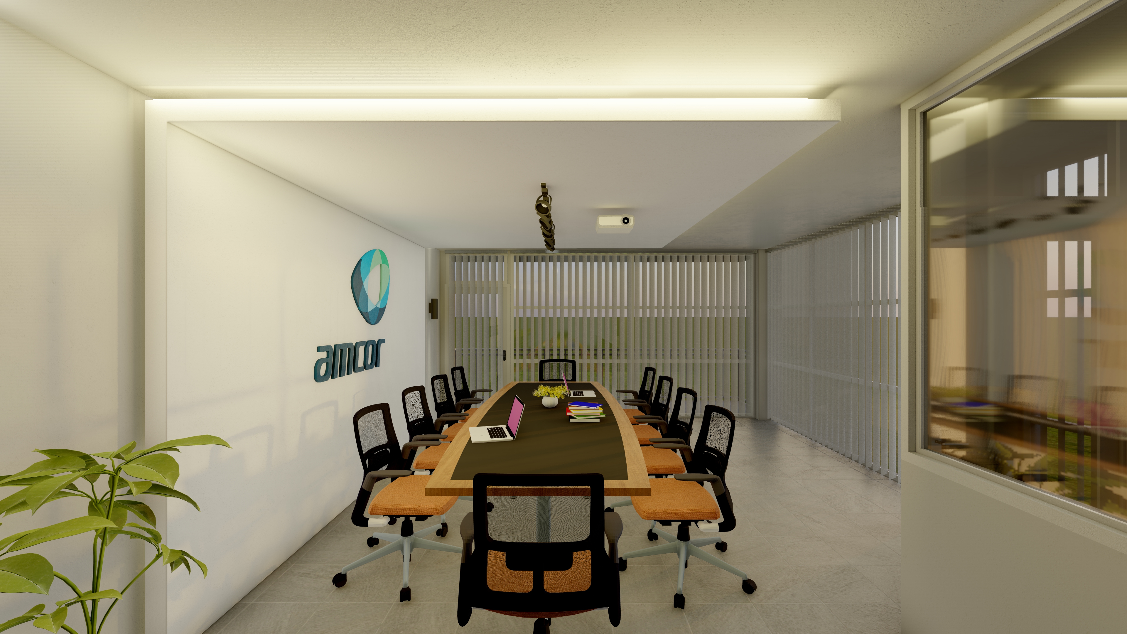 - Ortada yer alan uzun ahşap masa ve ergonomik sandalyeler, geniş katılımlı toplantılar için düzenlenmiş. Duvar üzerindeki şirket logosu kurumsal kimliği vurgularken, tavan aydınlatmaları ve yan ışıklar mekâna ferah ve profesyonel bir atmosfer kazandırıyor. Arka plandaki mini mutfak ve depolama alanı ise işlevselliği artırıyor.