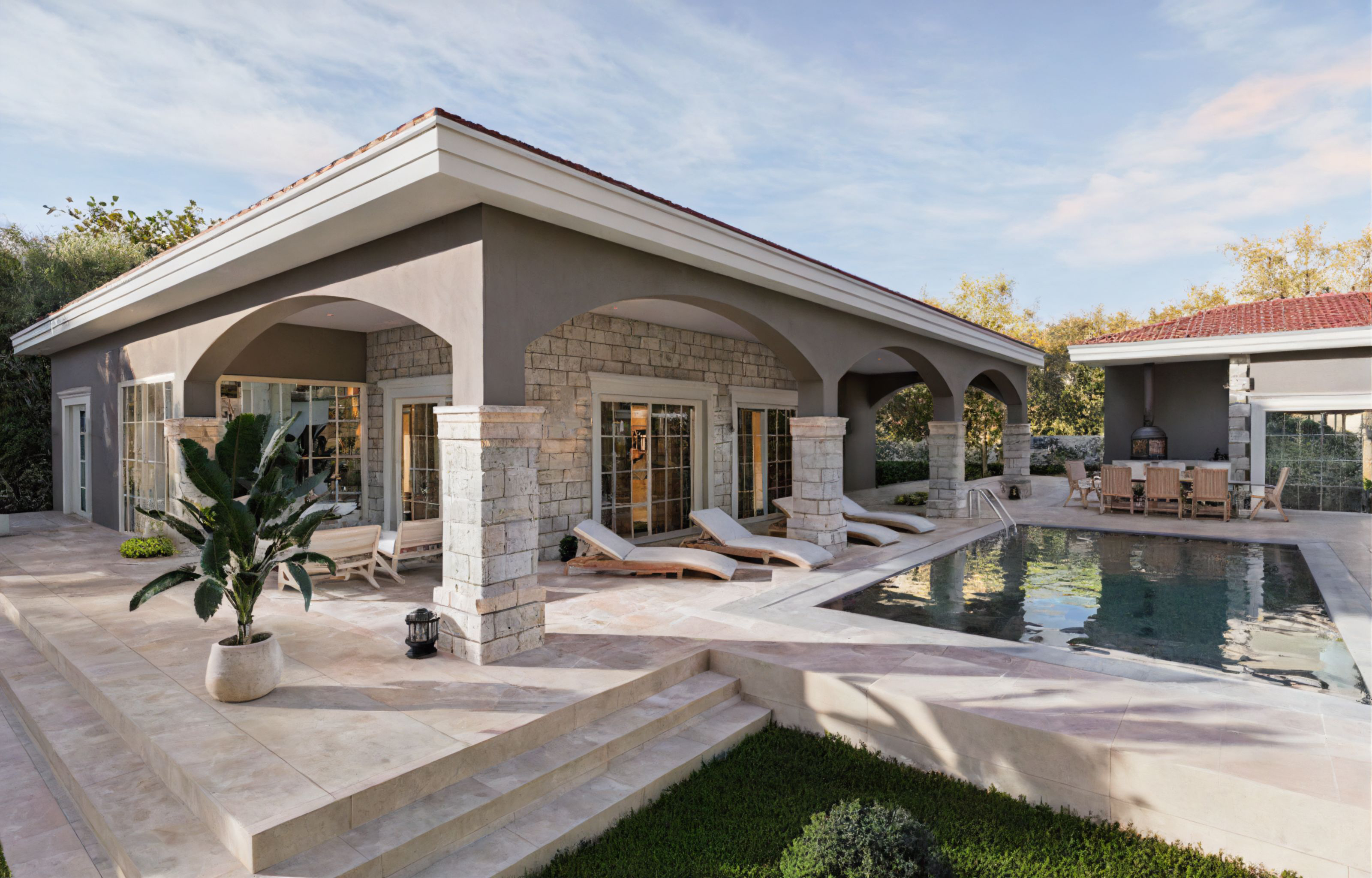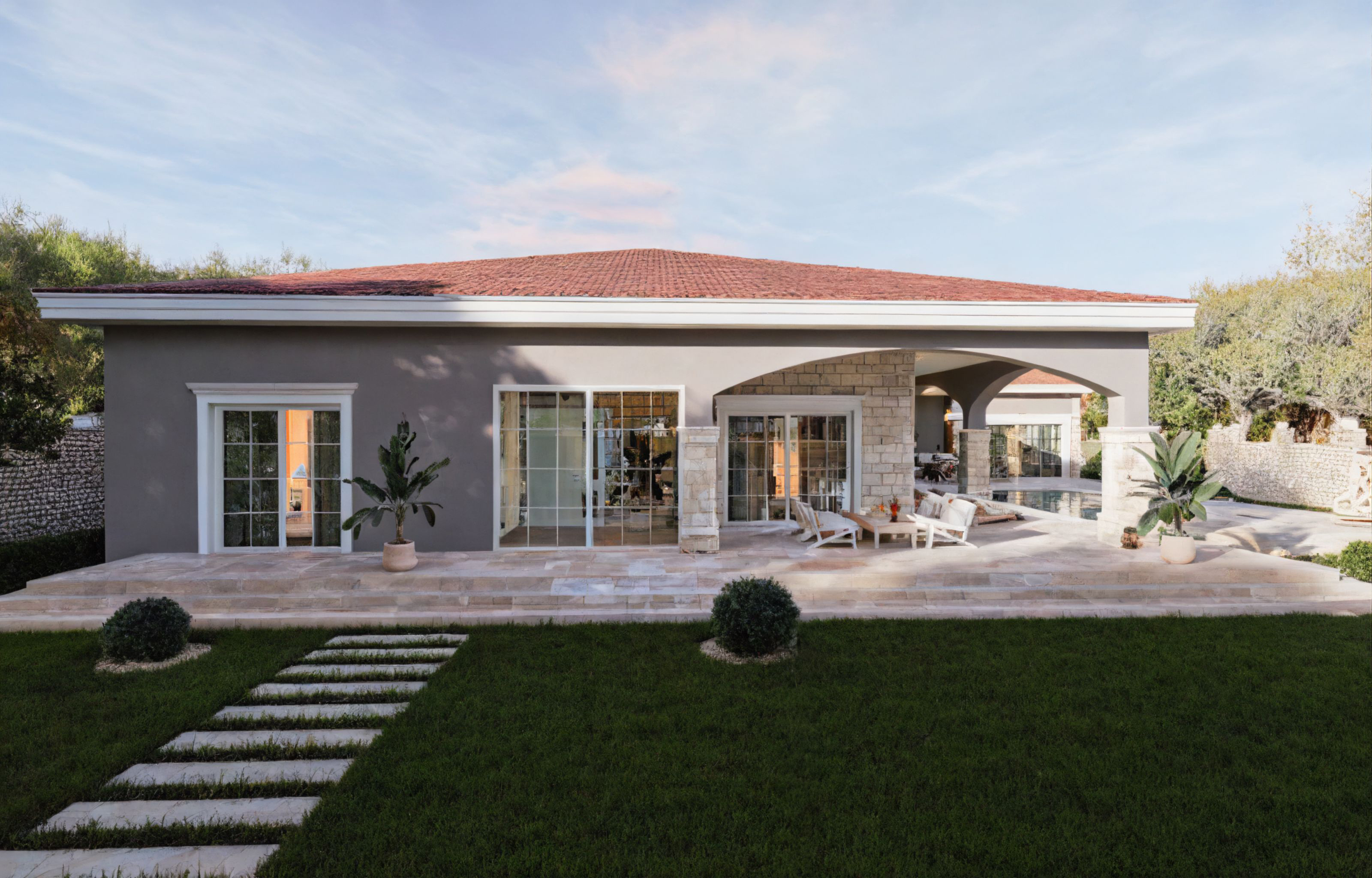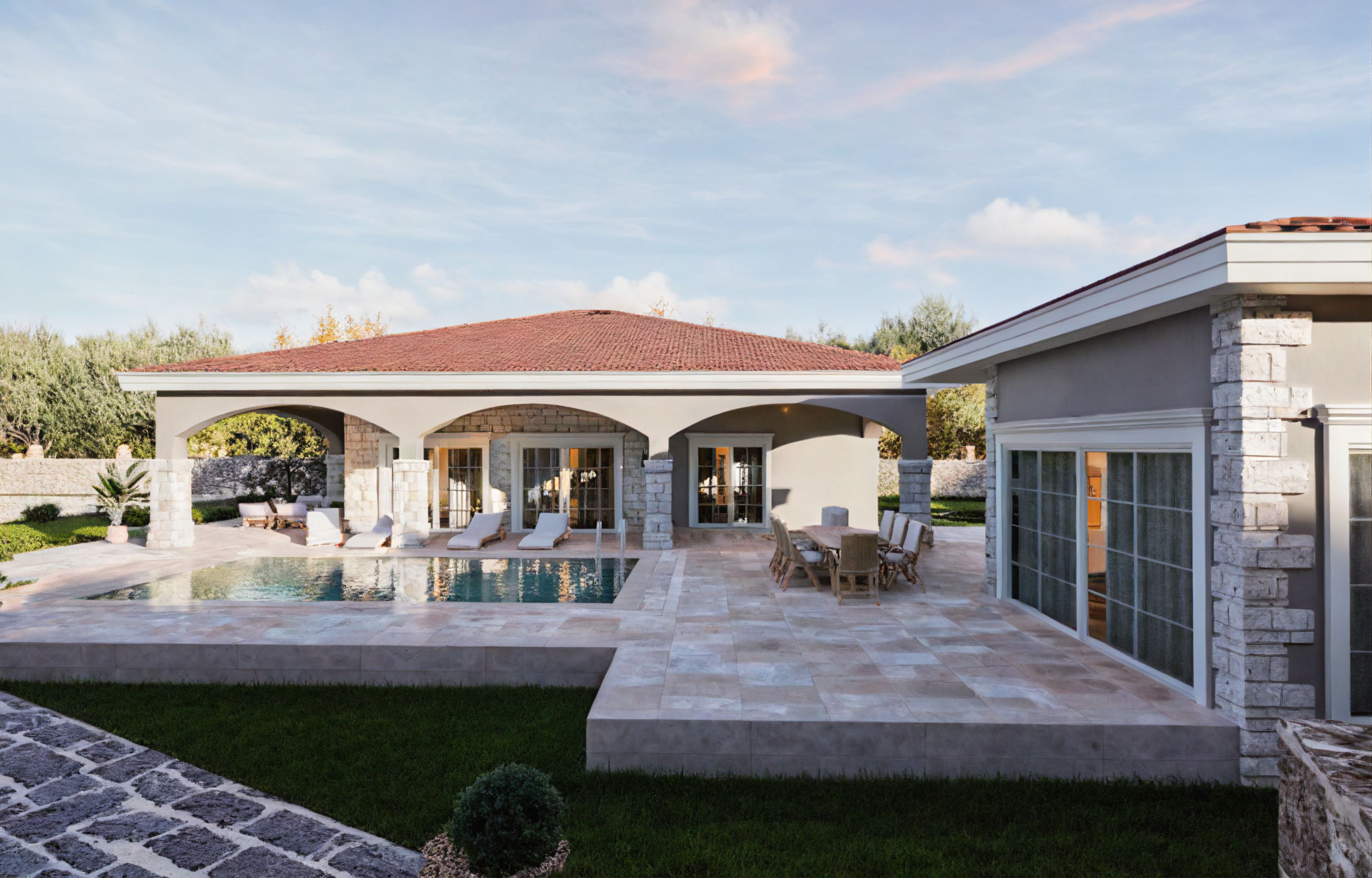 Dikdörtgen formda tasarlanan bu tek katlı taş kaplama ev, merkezinde uzunlamasına yerleştirilmiş havuzuyla ferah bir yaşam alanı sunar. Havuzun bir ucunda konumlanan kış bahçesi, dört mevsim kullanılabilen, ışık alan ve doğayla bütünleşen bir dinlenme alanı oluşturur. Taş kaplama cepheler, doğal dokusu ve dayanıklılığıyla öne çıkarken geniş cam yüzeyler, hem havuz hem de bahçe manzarasını iç mekânlara taşır. Modern planlama ve geleneksel malzeme birleşimi, Akdeniz iklimine uygun estetik ve konforlu bir yaşam sunar.