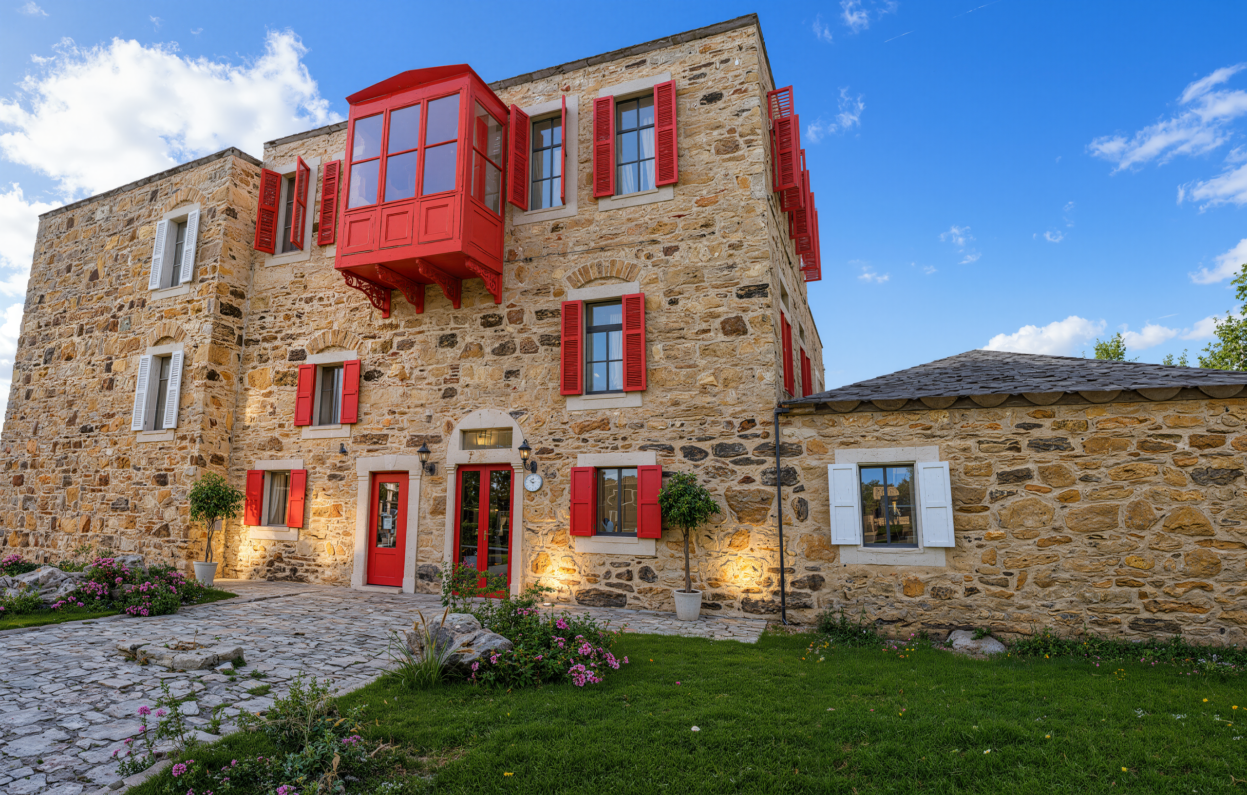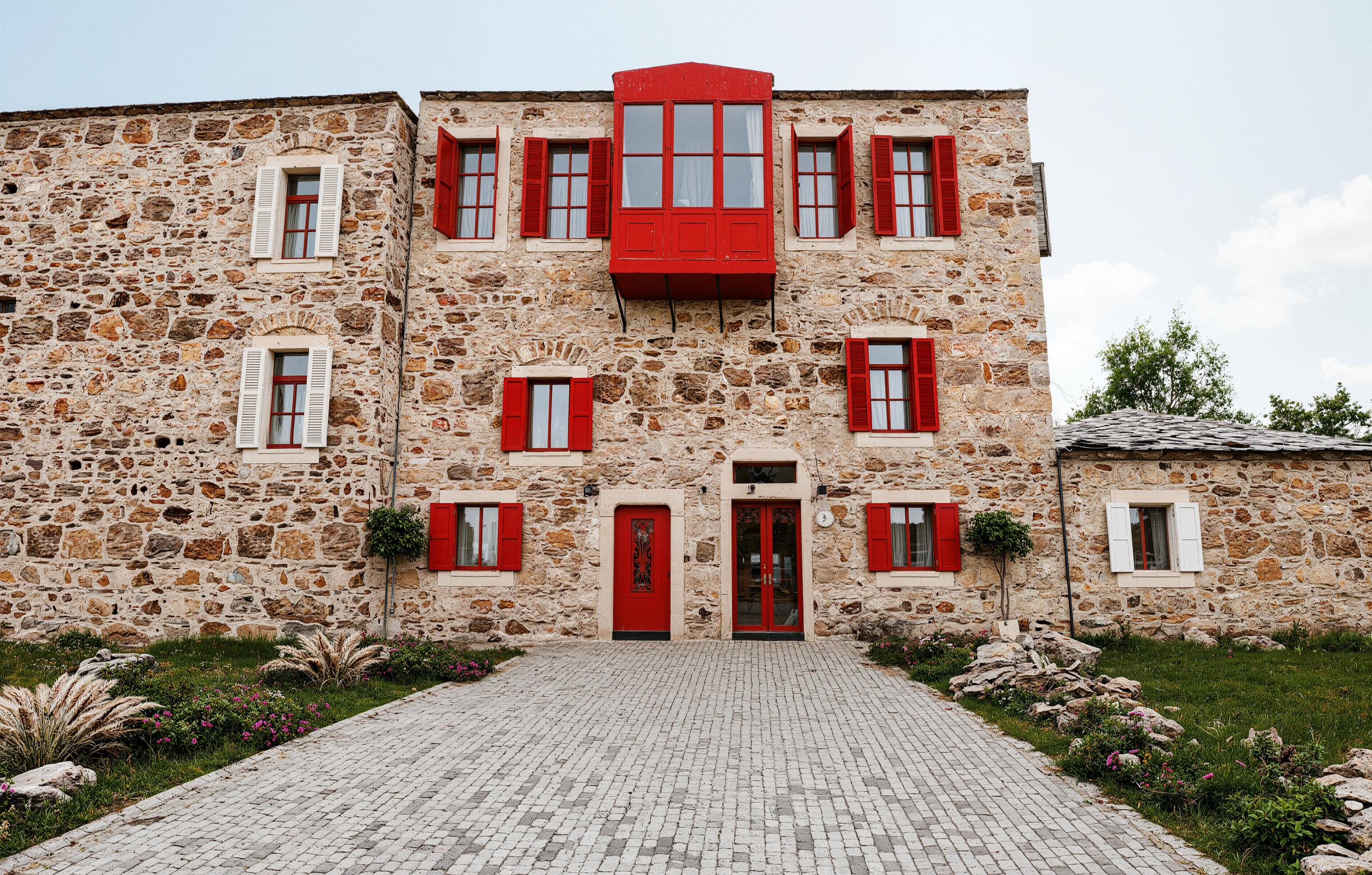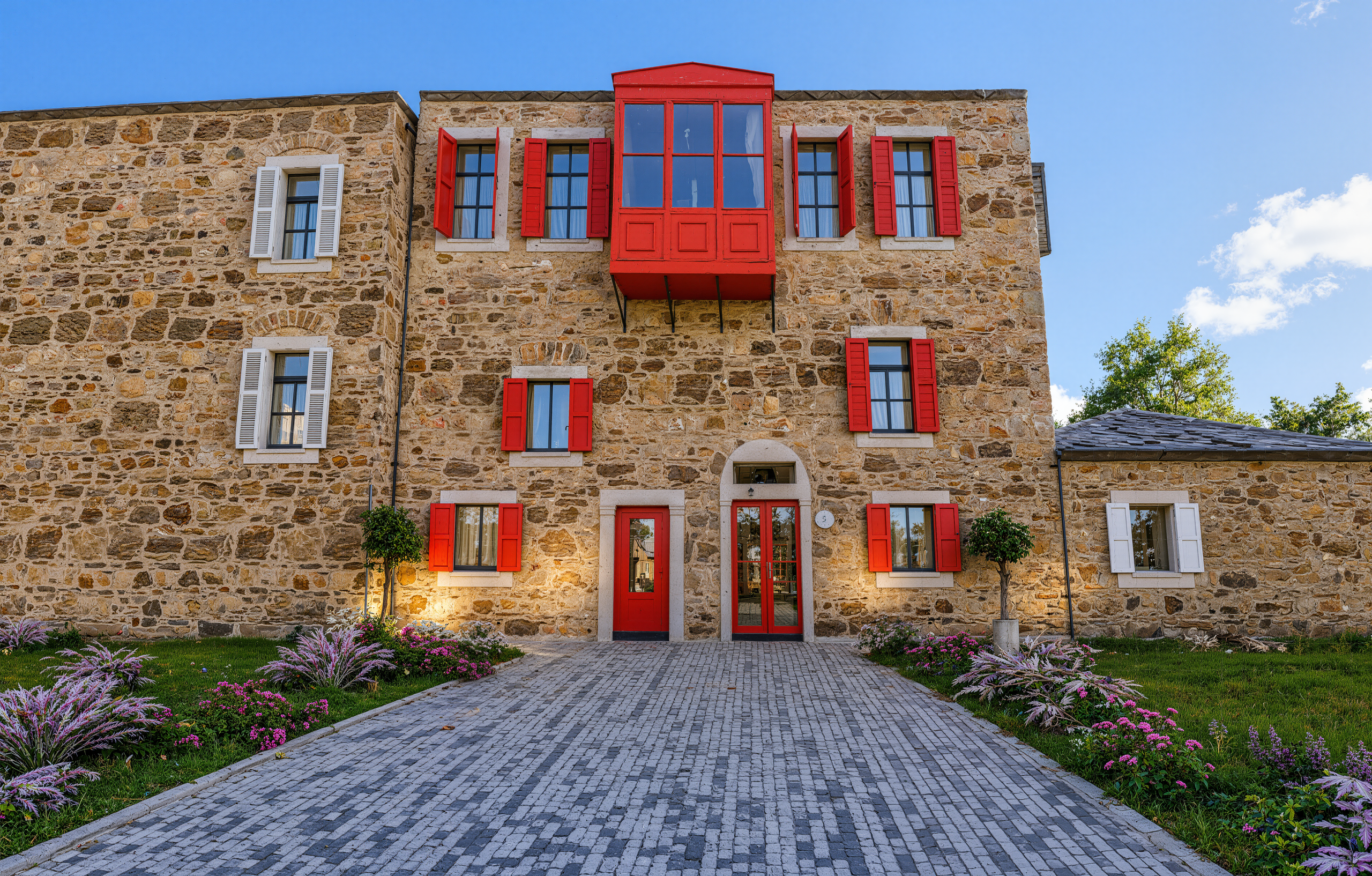 Üç katlı, zarif cumbalı ve canlı kırmızı panjurlarıyla dikkat çeken özel bir restorasyon projesi.